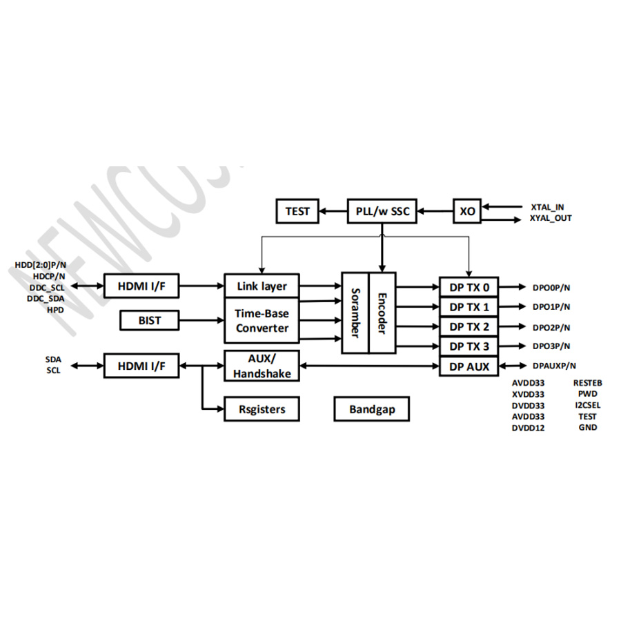 NCS8803 is a low-power HDMI-to-DisplayPort/eDP converter with advanced scaling function, fractional scaling ratio from 2:1 to 1:2, which is designed for mobile devices including tablets, laptops, monitor, etc. to support high-definition DP/eDP displays. NCS8803 supports 4-lane DP/eDP output which is typically required to support WQXGA (2560*1600) and above at 60Hz frame rate. NCS8803 Minimum support to XGA (1024*768@60Hz) fail safe mode. Thanks to our proprietary scaling algorithm, NCS8803 provides high picture quality. All the functions pack into a small 7mm*7mmQFN56 package which saves the precious space in mobile devices.