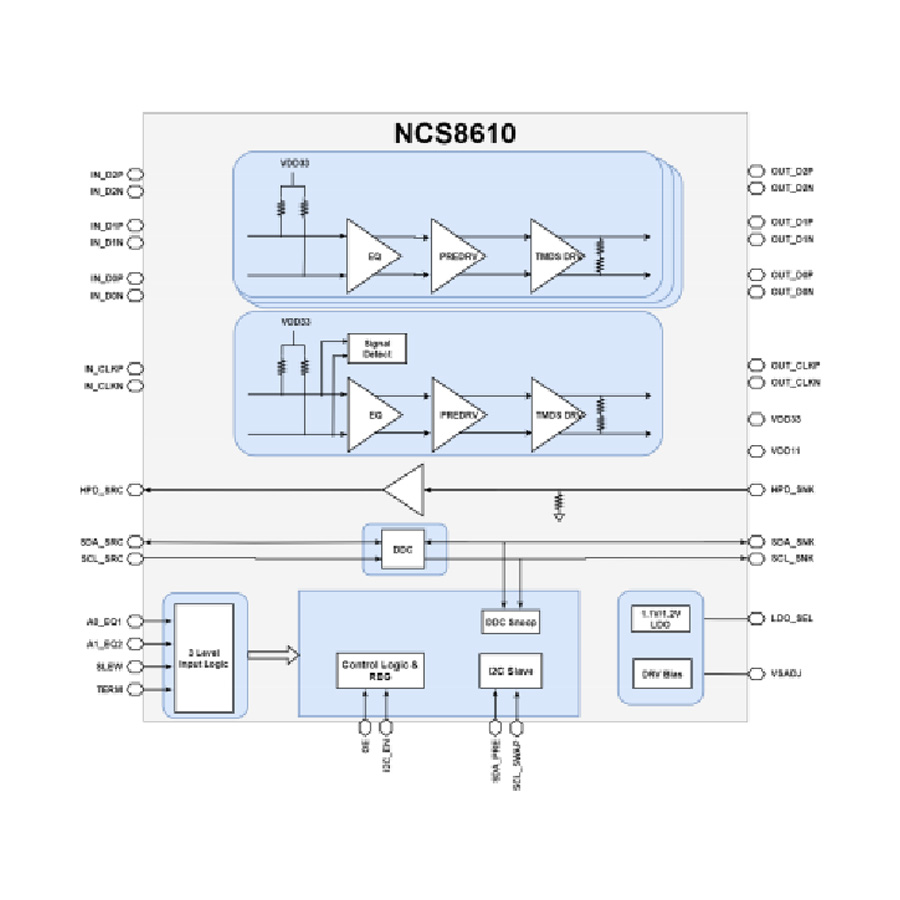 The NCS8610 is an AC/DC-coupled input HDMI signal to TMDS/DVI/FRL redriver supporting DVI 1.0 and HDMI 1.4b, 2.0b and 2.1 output signals. The NCS8610 supports four TMDS/FRL channels and Digital Display Control (DDC) interfaces. The NCS8610 supports signaling rates up to 6 Gbps at HDMI 2.0b or 12 Gbps at HDMI 2.1. The NCS8610 can be configured to support the HDMI2.0 or HDMI 2.1 standard. The NCS8610 supports dual power supply rails of 1.1V/1.2V on VDD11 and 3.3V on VDD33 for power reduction. The NCS8610 also supports single power supply rail of 3.3V on VDD33 and embedded LDO of 1.1V/1.2V on VDD11 by package pin option for cost sensitive application. NCS8610 supports fixed receiver EQ gain using I2C or pin strap to compensate for different lengths input cable or board traces.