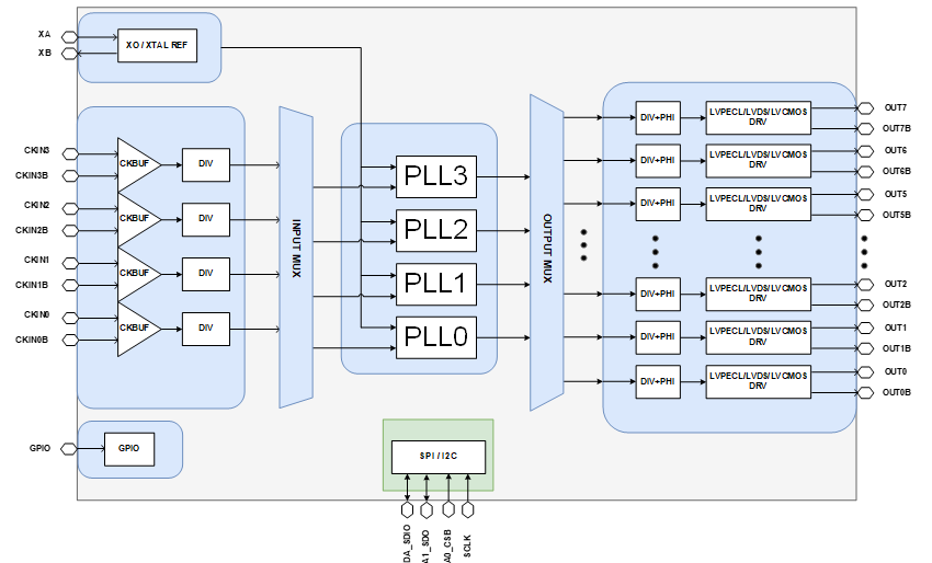 • Supports up to 4 independent APLL/DPLL loops and 8 outputs